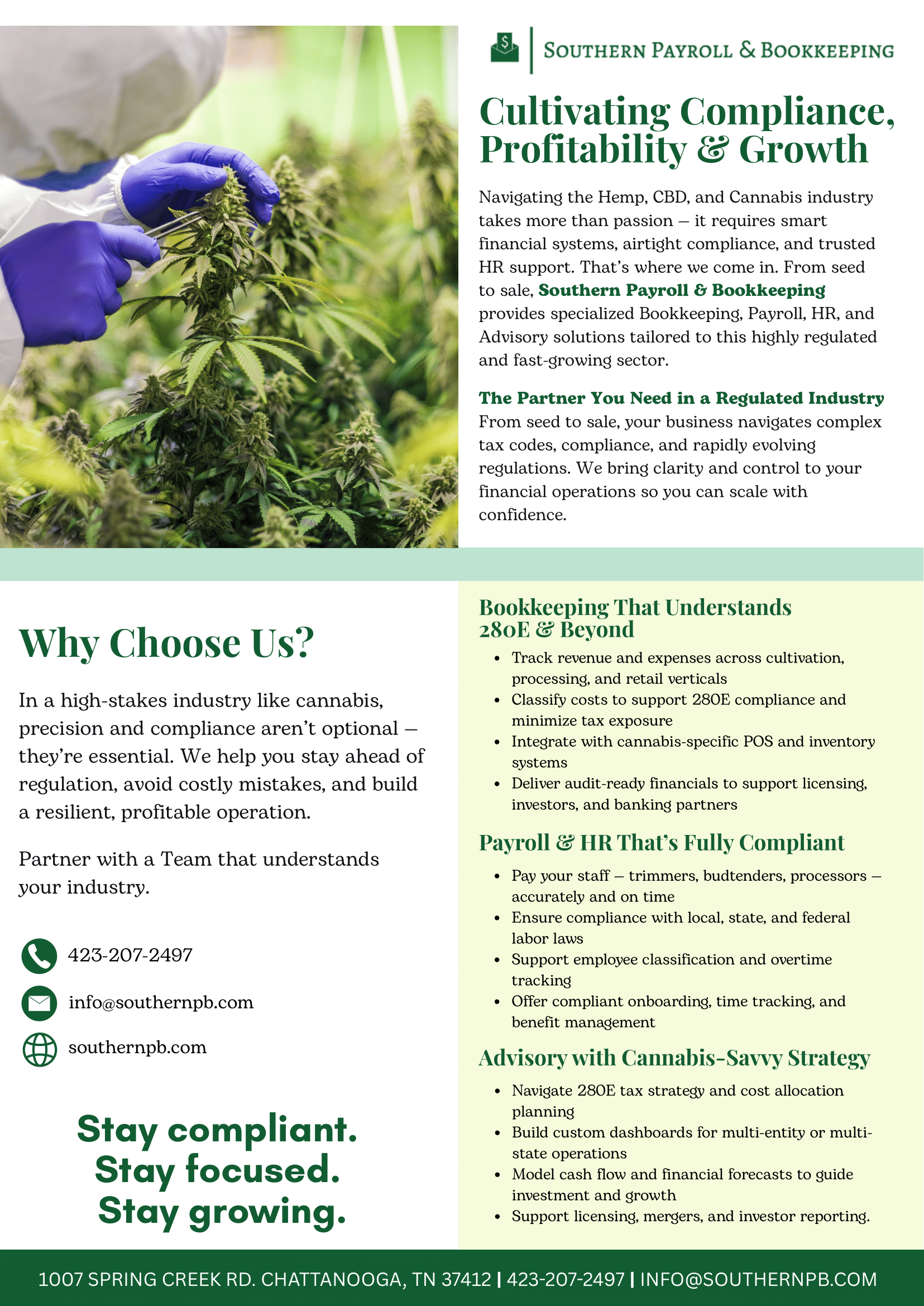 Navigating the Hemp, CBD, and Cannabis industry takes more than passion — it requires smart financial systems, airtight compliance, and trusted HR support. That’s where we come in. From seed to sale, Southern Payroll & Bookkeeping provides specialized Bookkeeping, Payroll, HR, and Advisory solutions tailored to this highly regulated and fast-growing sector.