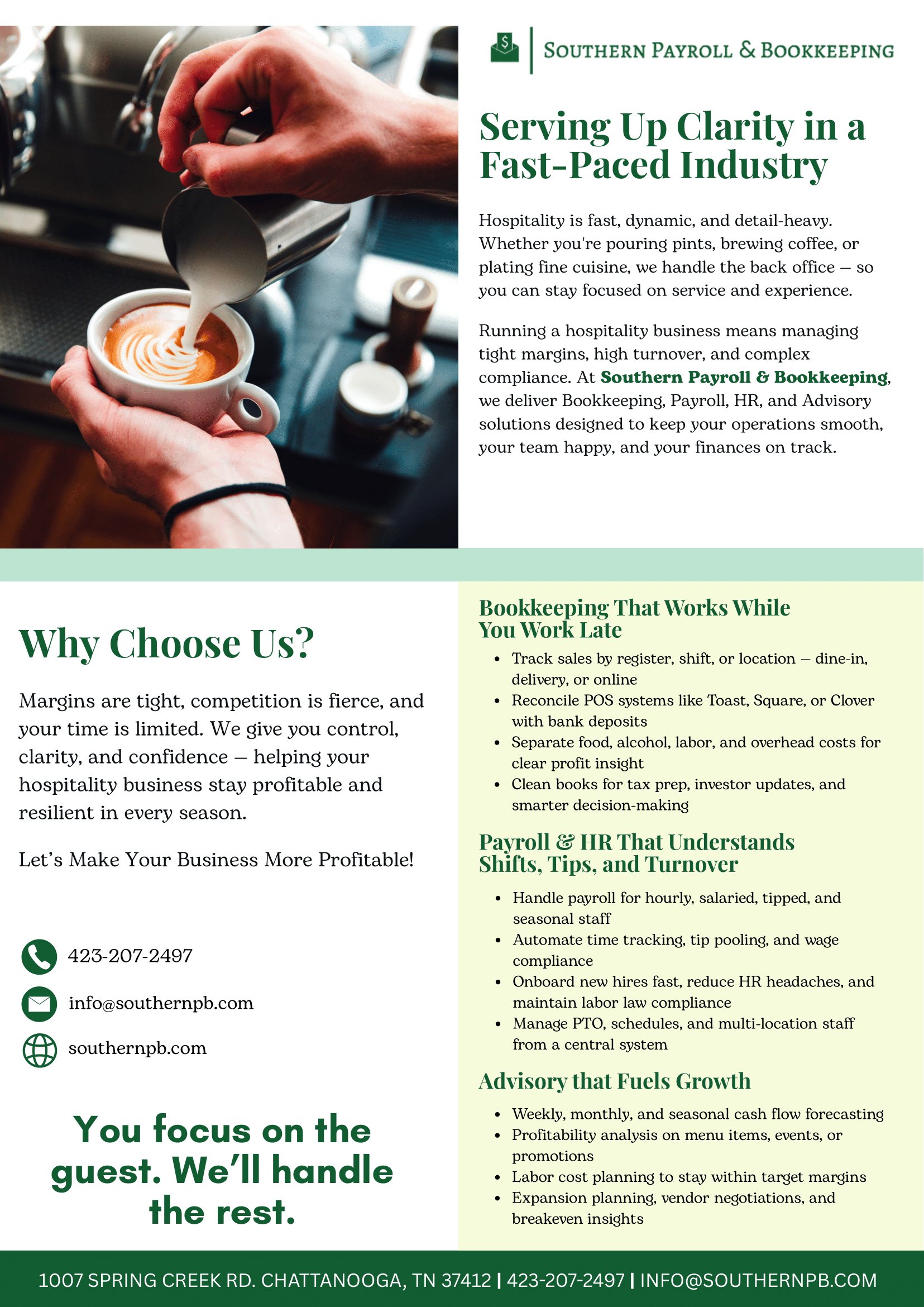 Hospitality is fast, dynamic, and detail-heavy. Whether you're pouring pints, brewing coffee, or plating fine cuisine, we handle the back office — so you can stay focused on service and experience. Running a hospitality business means managing tight margins, high turnover, and complex compliance. At Southern Payroll & Bookkeeping, we deliver Bookkeeping, Payroll, HR, and Advisory solutions designed to keep your operations smooth, your team happy, and your finances on track.