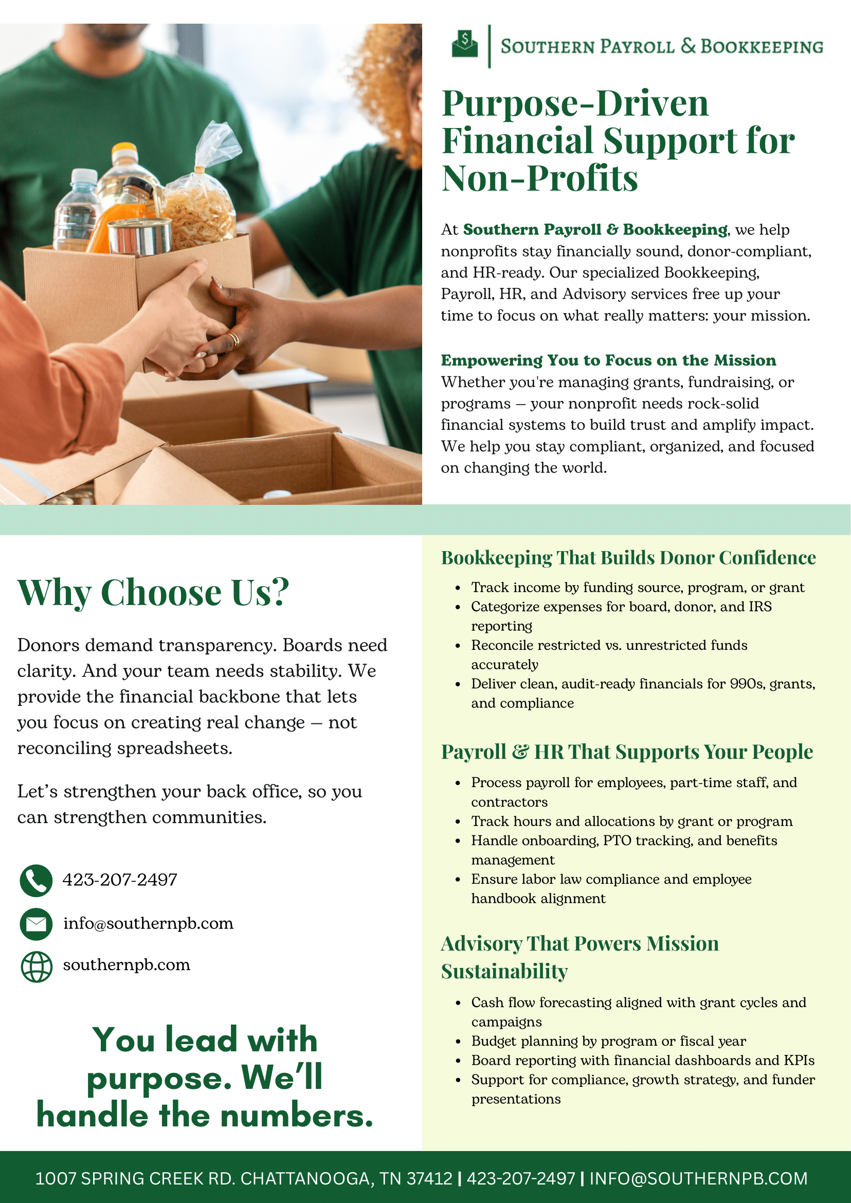 At Southern Payroll & Bookkeeping, we help nonprofits stay financially sound, donor-compliant, and HR-ready. Our specialized Bookkeeping, Payroll, HR, and Advisory services free up your time to focus on what really matters: your mission.