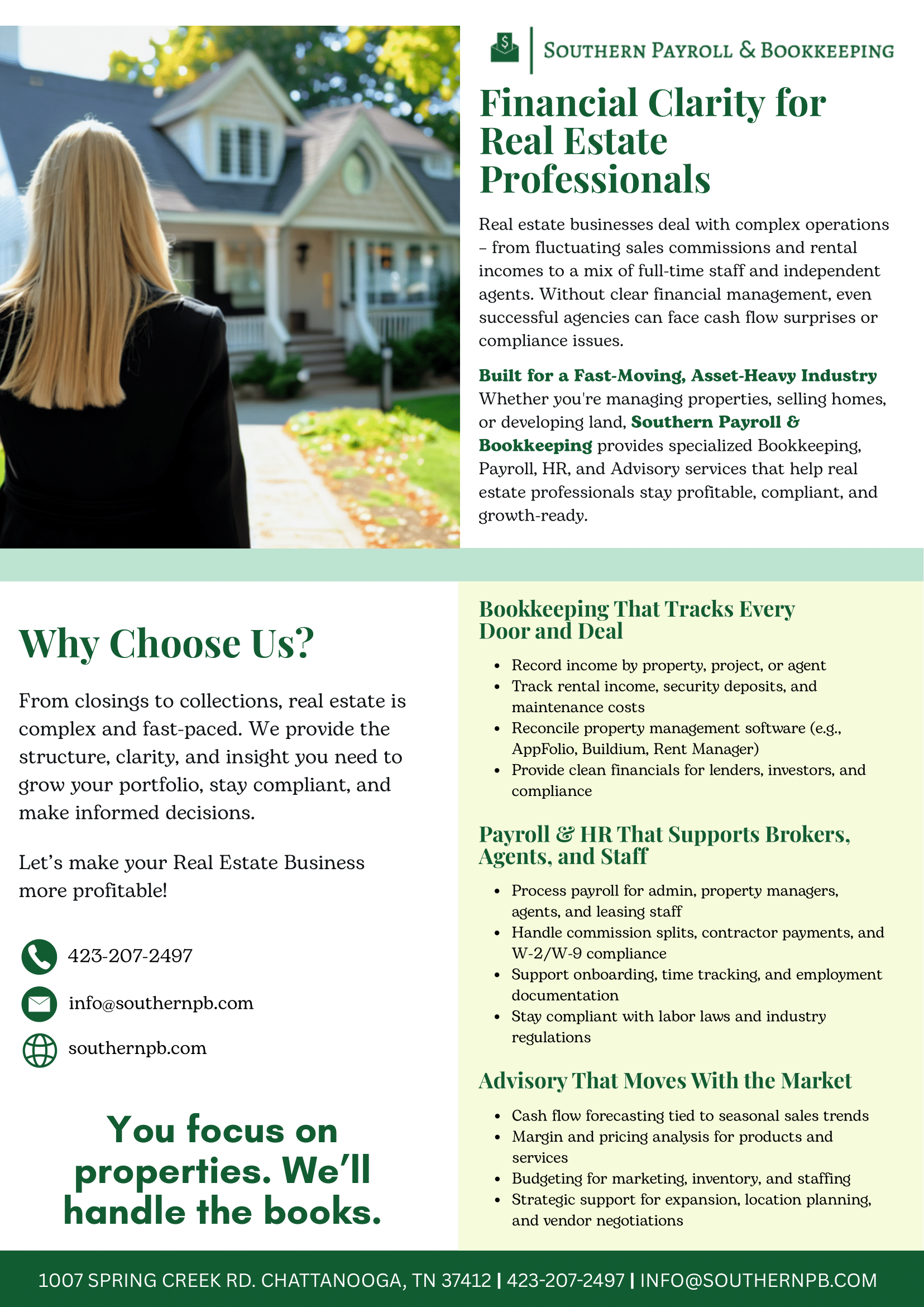 Whether you're managing properties, selling homes, or developing land, Southern Payroll & Bookkeeping delivers specialized Bookkeeping, Payroll, HR, and Advisory services to help real estate professionals stay profitable, compliant, and ready to grow.